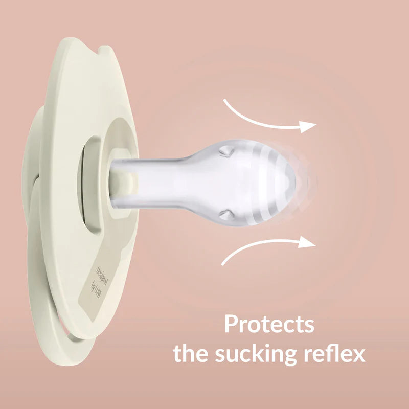 La partie d’aspiration dynamique est composée de plusieurs couches de silicone de différentes épaisseurs. Elle s’étire et se contracte au rythme de la succion de bébé, pour une sensation qui rappelle l’allaitement. Ce système unique favorise une acceptation rapide tout en assurant un usage sûr.