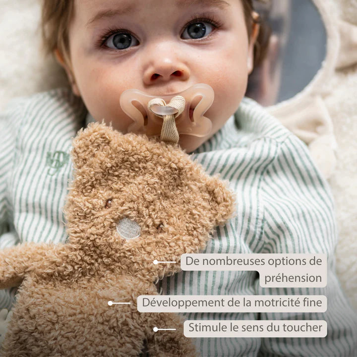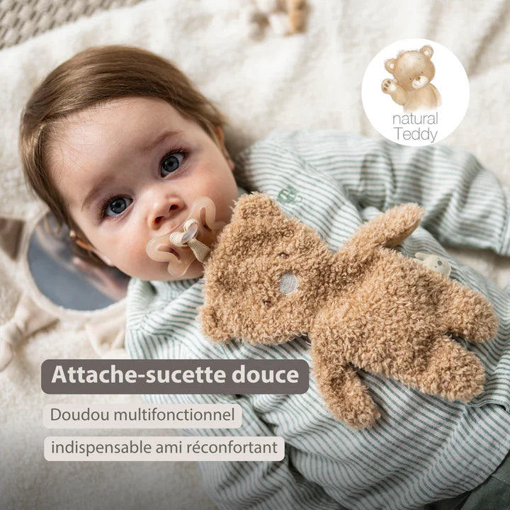 Ce doudou ours pour sucette de Nattou allie douceur, réconfort et praticité pour accompagner bébé dans chaque moment de la journée. Conçu dans un mélange de velours moelleux et de tissu teddy ultra doux, il offre une sensation rassurante dès les premiers instants.