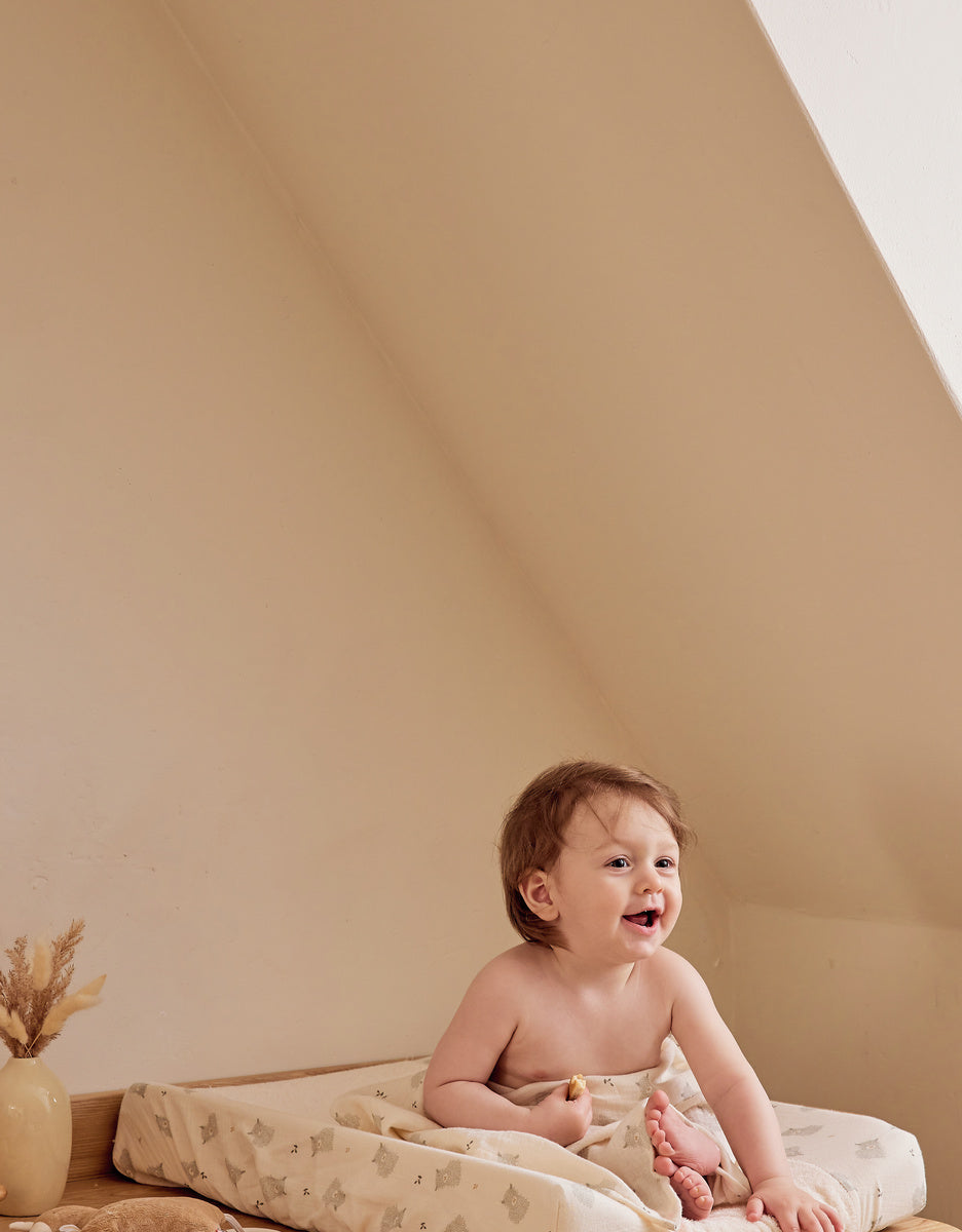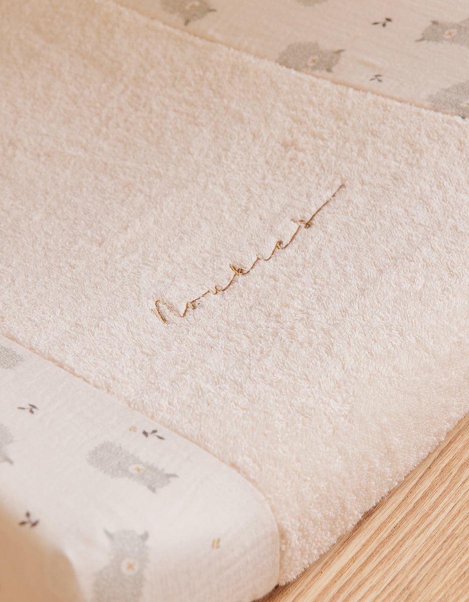 La housse de coussin à langer écru, issue du thème Fluffy, Orso & Lily, est confectionnée en éponge épaisse pour offrir à bébé confort et douceur à chaque change. Son tissu absorbant et moelleux rend le moment du soin plus agréable, tout en assurant une hygiène optimale.