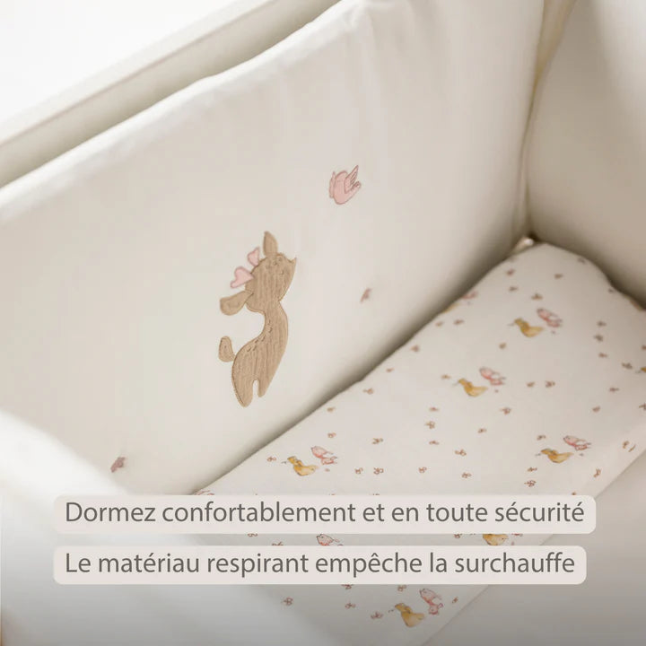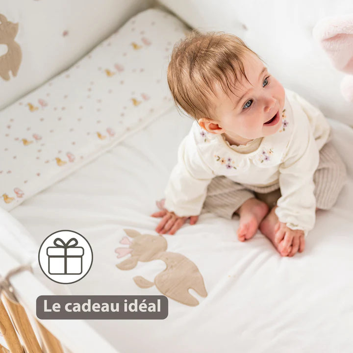 Fabriqué en gaze de coton 100 % avec une finition en velours ultra doux, ce plaid allie confort, élégance et praticité. Son motif tendre et sa couleur blanche neutre s’intègrent parfaitement dans toutes les décorations de chambre de bébé.