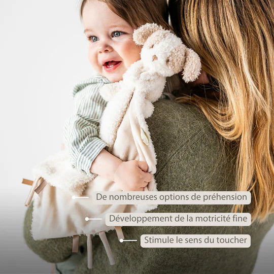 Ce doudou avec peluche chien de Nattou deviendra vite le compagnon préféré de votre tout-petit. Conçu pour apporter réconfort, sécurité et douceur, il offre une texture moelleuse et de multiples points de préhension, parfaits pour les petites mains curieuses.