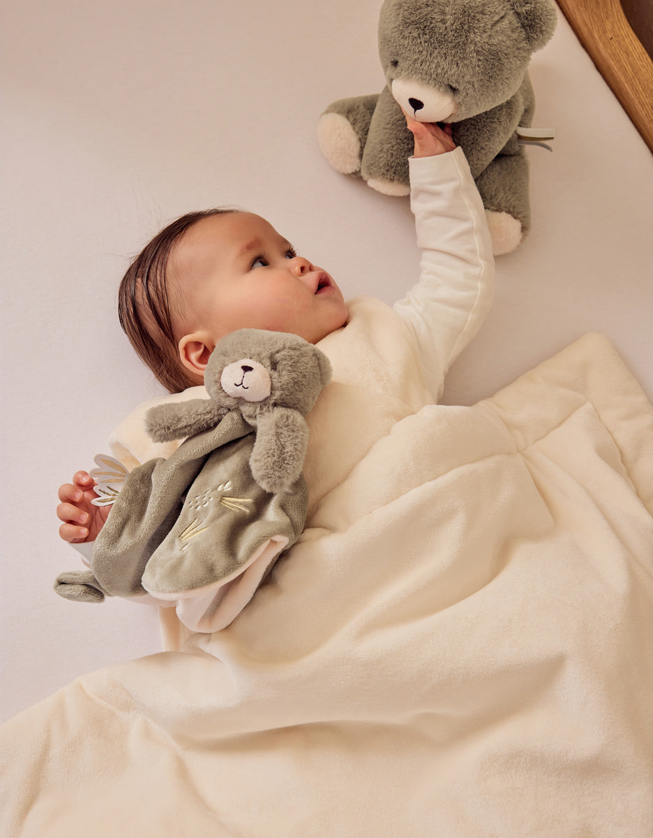 Avec sa fourrure kaki ultra douce en Veloudoux®, Orso l’ours est le doudou parfait pour accompagner bébé dès ses premiers jours. Brodé de motifs inspirés de la nature, il allie tendresse, réconfort et praticité pour apaiser bébé au quotidien.