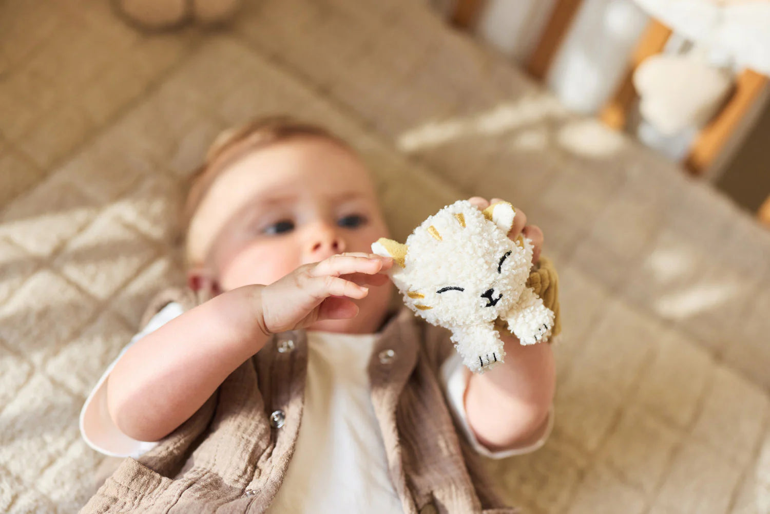 Un petit compagnon tout doux pour éveiller bébé en douceur ! Ce hochet de poignet est à la fois amusant et rassurant, toujours à portée de main pour accompagner les premiers mouvements de votre tout-petit.