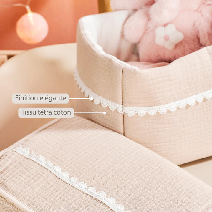 Confectionné en gaze de coton douce, il séduit par sa matière légère et sa finition élégante, qui lui permettent de s’intégrer naturellement dans tous les intérieurs. Placé près de la table à langer, du plan de toilette ou dans une étagère, il offre un rangement pratique et raffiné pour une organisation simple et efficace.