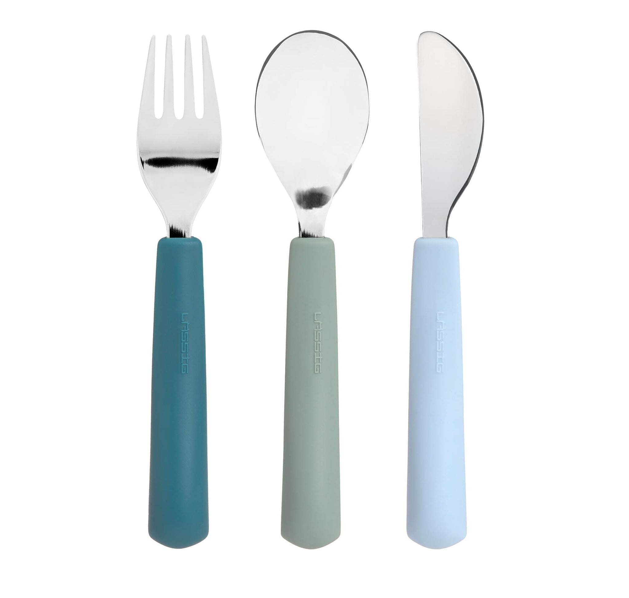 Le set de couverts LÄSSIG Tiny Team accompagne les premiers repas autonomes des tout-petits avec praticité et sécurité. Composé d’une cuillère, d’une fourchette et d’un couteau d’apprentissage à bords arrondis, il est spécialement conçu pour les enfants dès 12 mois.