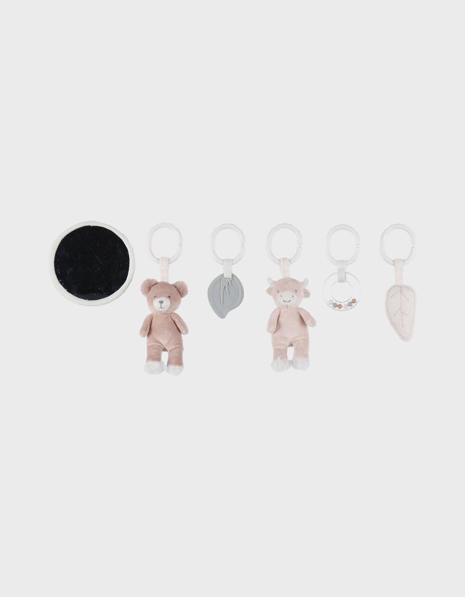 Nombreuses activités : 1 clochette, 1 pouet, 3 éléments en papier froissé, 1 miroir, 1 jouet de dentition, 1 hochet.