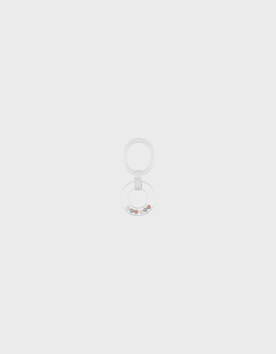 Oreilles en papier froissé et hochet à billes pour éveiller l’ouïe et la curiosité.